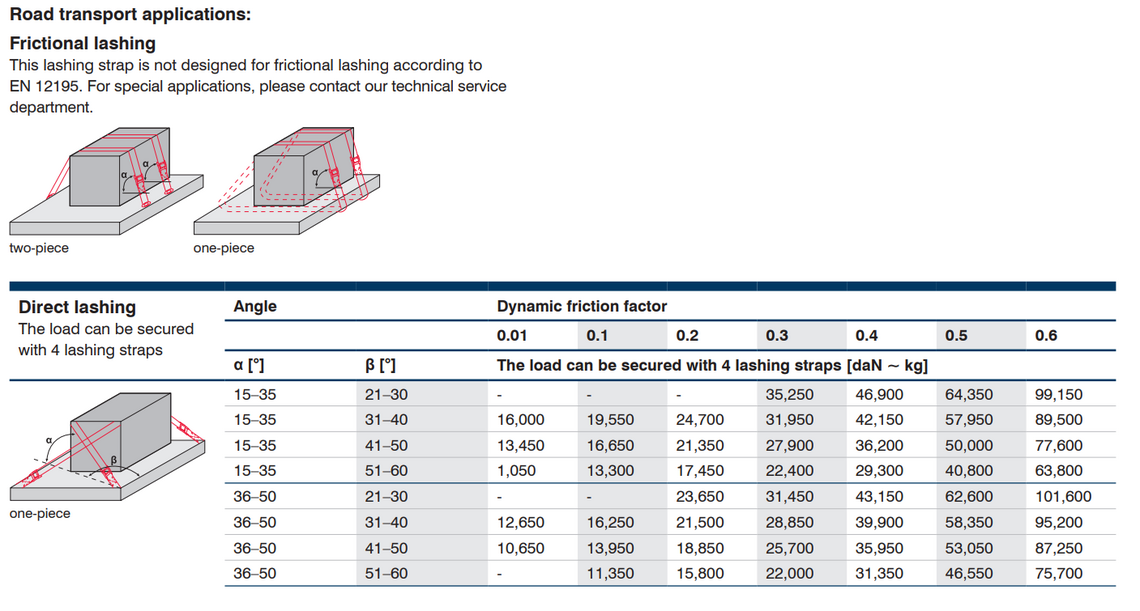 Duży zakres szerokości pasów, od 25 do 75 mm i sił mocujących od 250 do 5.000 daN może być uzupełniony przez rozwiązania specjalne, uwzględniające specyficzne wymagania klientów. Na każdym odcinku pasa ściągającego są umieszczone dane techniczne i informacja dla użytkownika.